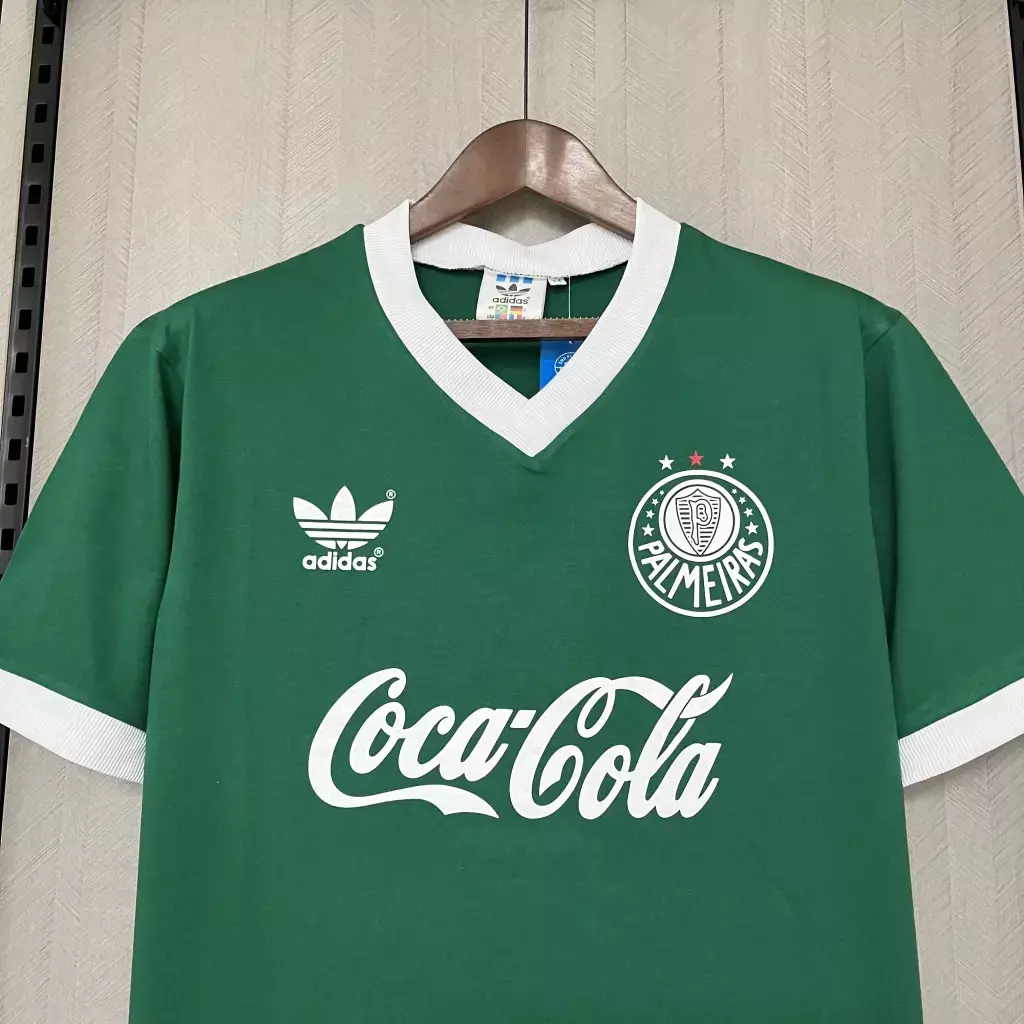 Essa é a camisa histórica retrô do Palmeiras usada em 1989, esse modelo possui a cor predominantemente Verde.