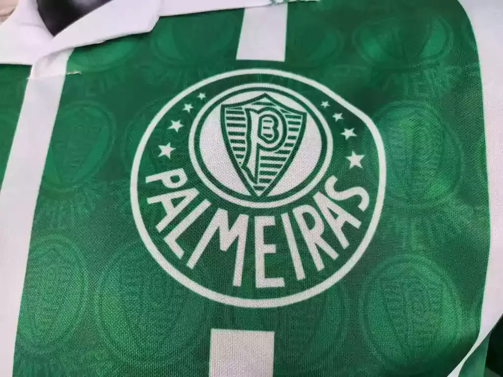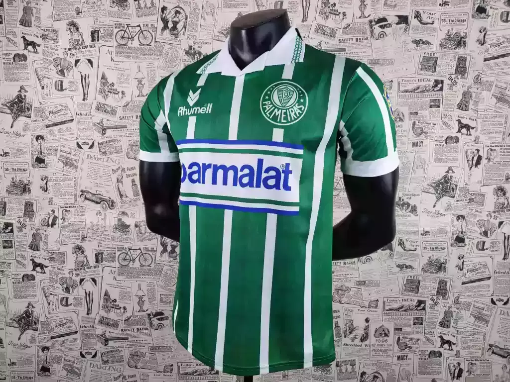 Essa é a camisa histórica retrô do Palmeiras usada em 1993/1994, esse modelo possui a cor predominantemente Verde.
